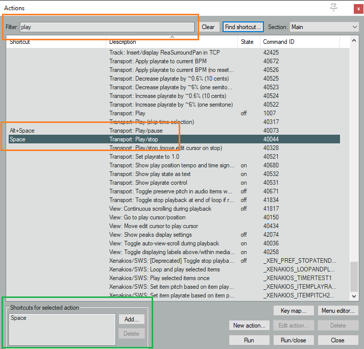 | Space | Transport: Play/stop | 40044 | Transport |